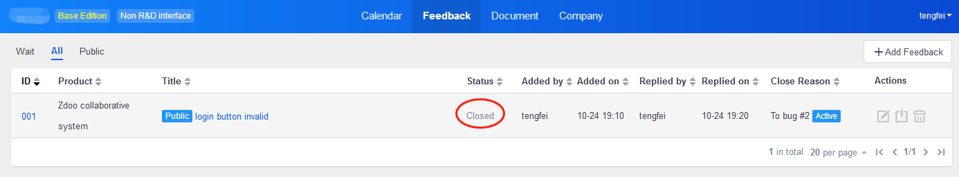 The feedback can be managed via the Edit, Close, and Delete buttons located in the right-hand side action bar.