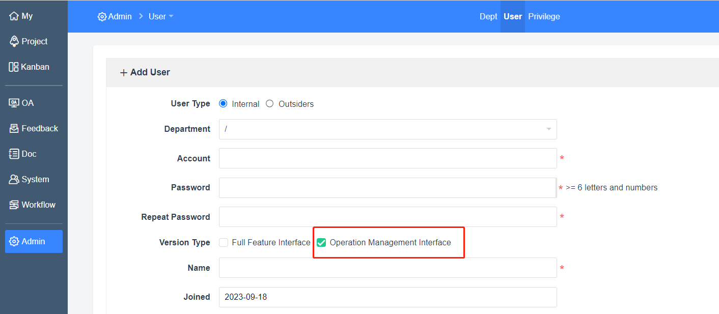 To create lite users in the Full Feature Interface, we need to go to Admin - User - Add User, and only tick the box of "Operation Management Interface".
