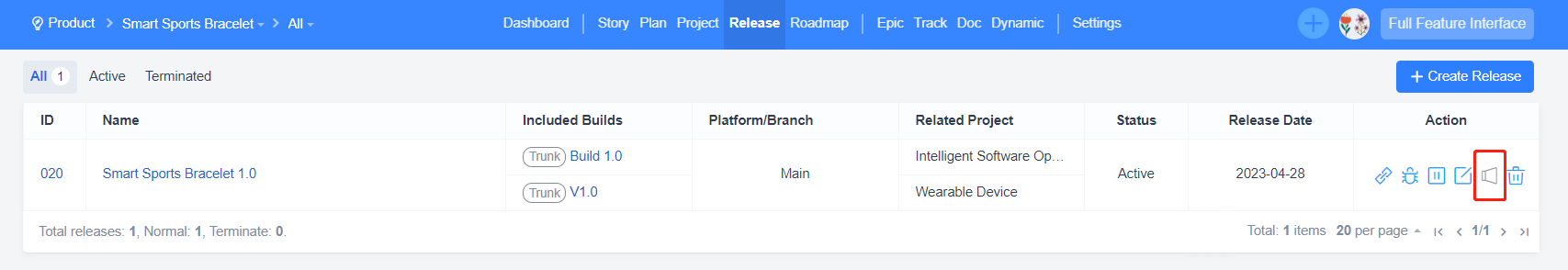 If the created release has not been associated with any stories or bugs yet, the notification button will be grayed out.