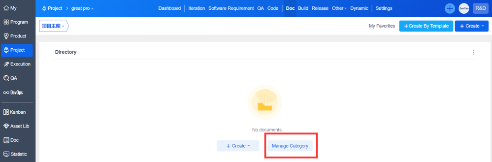 In the Doc section, it's available for you to create documents in various formats, create document libraries, or quickly create documents from templates. What's more, you can view the documents under the main project library, as well as create other project document libraries per your needs.