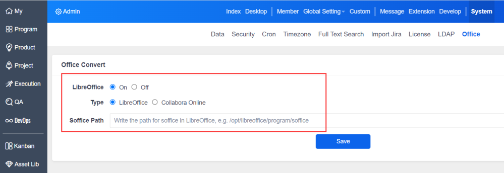 If you want to create documents in the format of Word, PPT, or Excel, it's required to enable the conversion in "More"-"Admin"-"System"-"Office" and make some configurations.