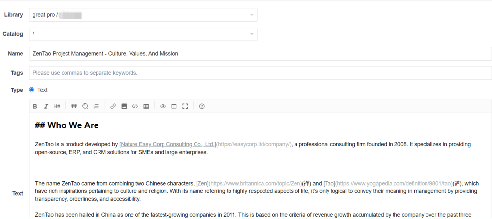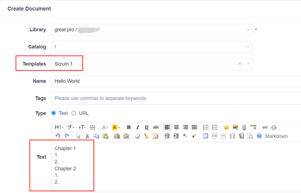 Let's take an example of the Markdown file. Select "Markdown" and fill in the information.