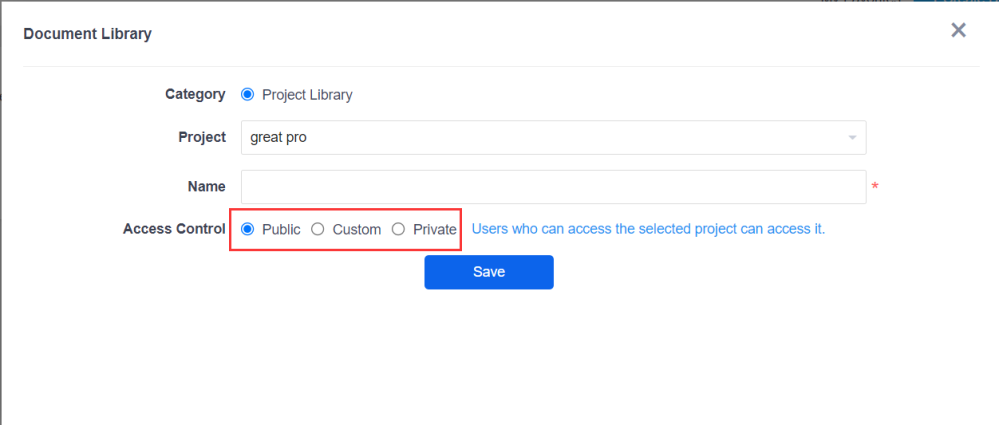 A main library of the project will be created automatically after the project is created. Besides, you can create other project document libraries per your needs.