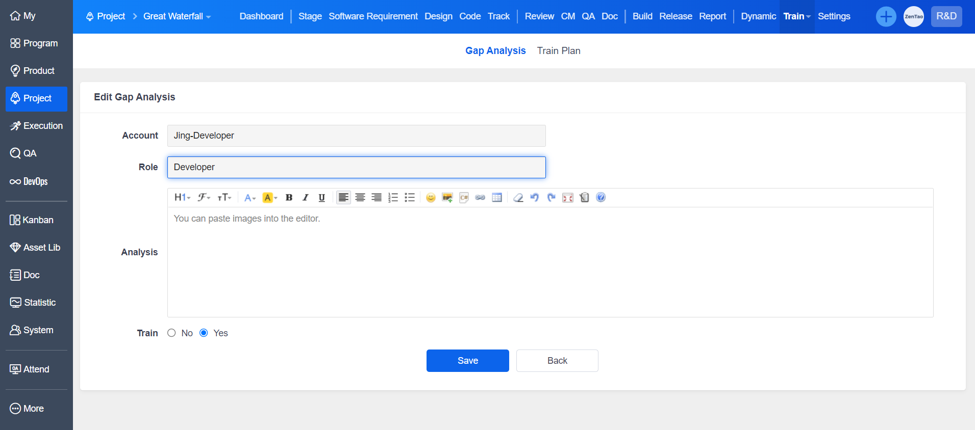Click "Create Gap Analysis" in "Waterfall Project"-"Other"-"Training", and then fill in the "Analysis".