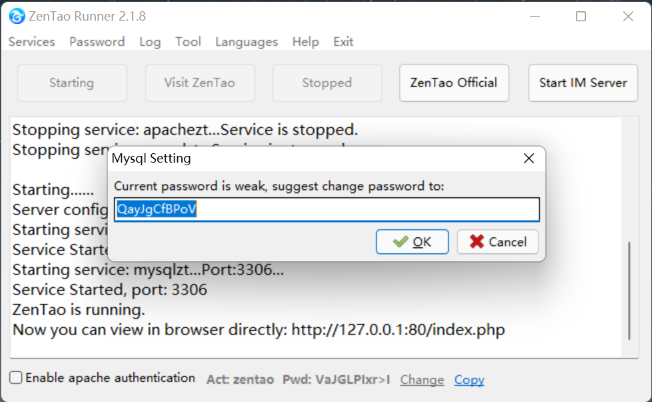 2.1 Once started, a prompt will remind you to change the database password. You can use the password recommended or set one for your own.