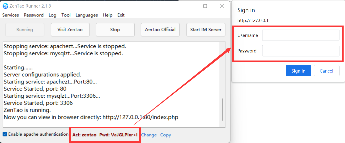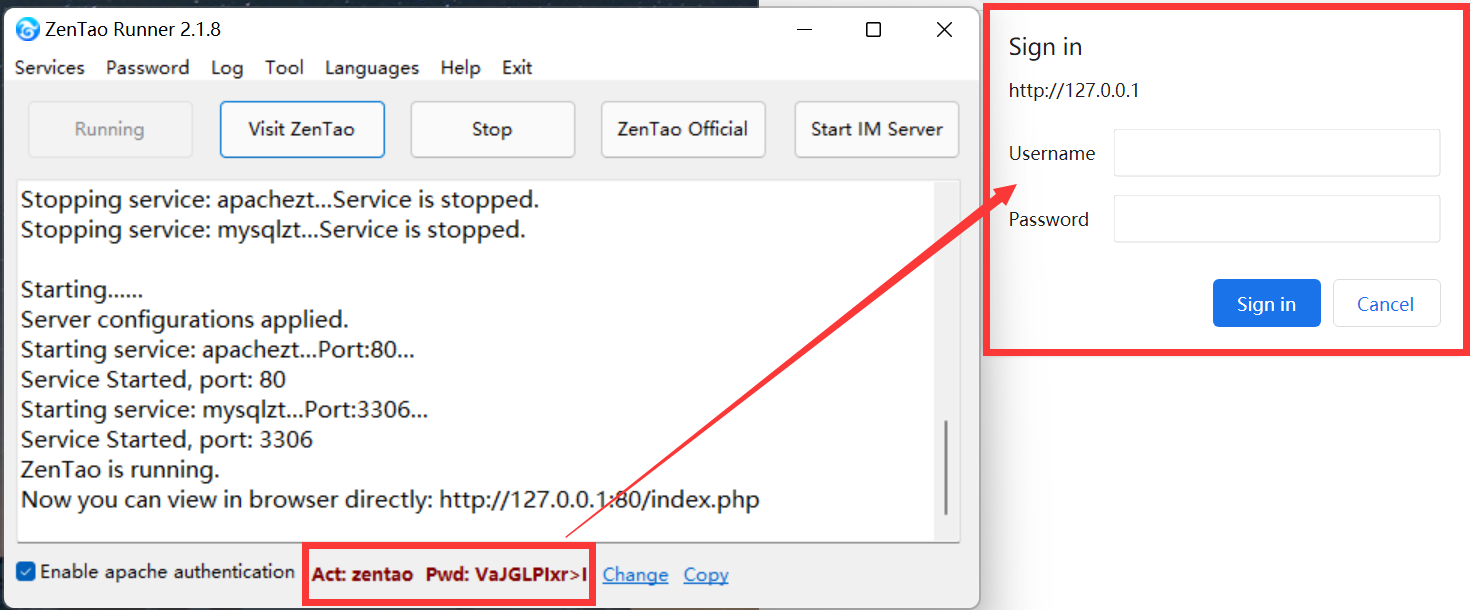4.1 If Apache authentication is enabled, users have to enter the account and password to visit ZenTao. Non-Admin users have to ask for the account and password from the Admin.