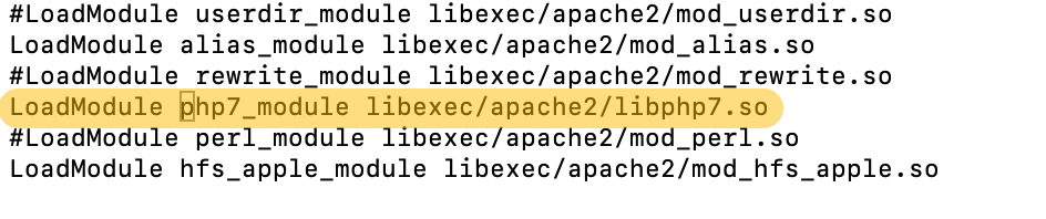 2.2.2 Open httpd.conf of Apache. Search "php" and you will have # LoadModule php7_module libexec/apache2/libphp7.so
