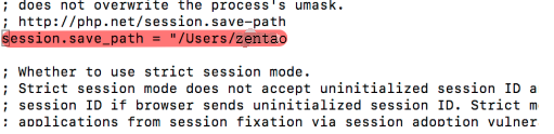 Modify the PHP configuration file located at /etc/php.ini.default. After backing up the php.ini.default file, rename php.ini.default to php.ini and search for session.save_path = "/ tmp", modify the value of "/tmp", it is recommended to modify the path to /Users/zentao (the path can be customized to any real path), as shown in the figure below.