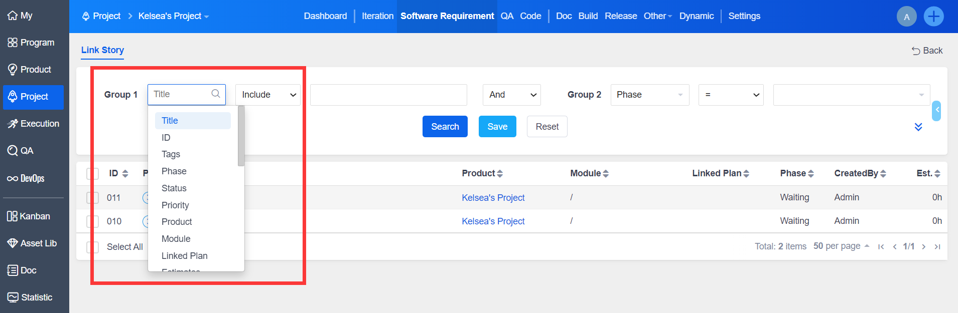 1.1 Go to a specific project, click "Software Requirement" to enter the requirement list page.