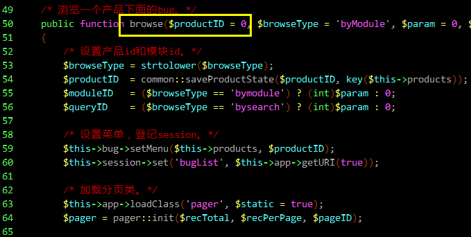 "control" method is the entrance of each page. Let's take bug-browse-1.html and /?m=bug&f=browse&productID=1&t=html as examples.