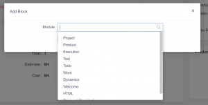 Blocks that can be added includeing: project, product, execution, test, todos, assign to me, dynamic, flowchart, welcome, HTML, personal contribution, etc. The position can also be moved.