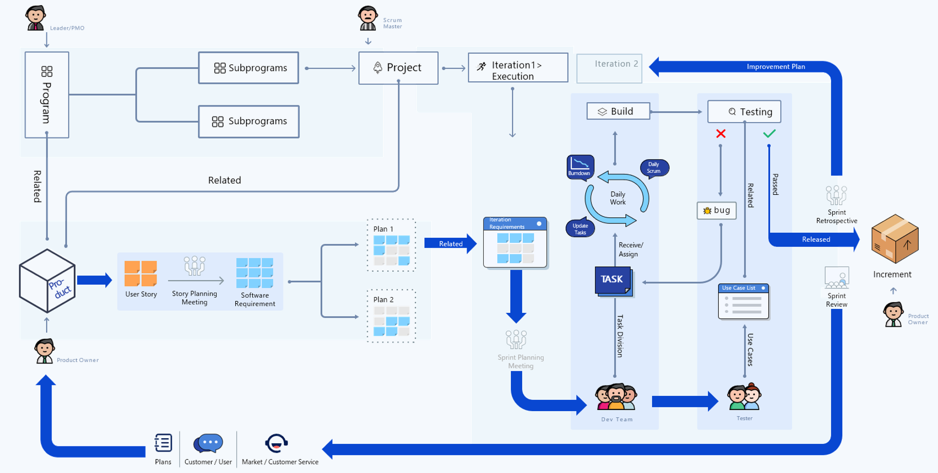 - Iterating in Sprint (2-4 weeks), including product design, development, and testing