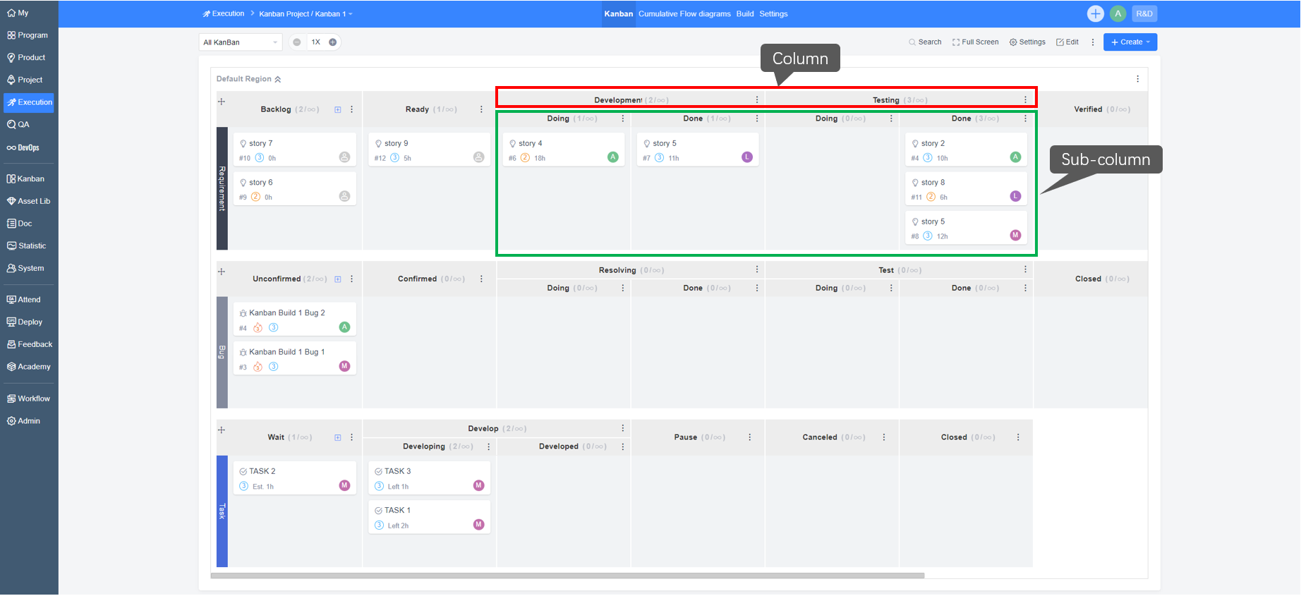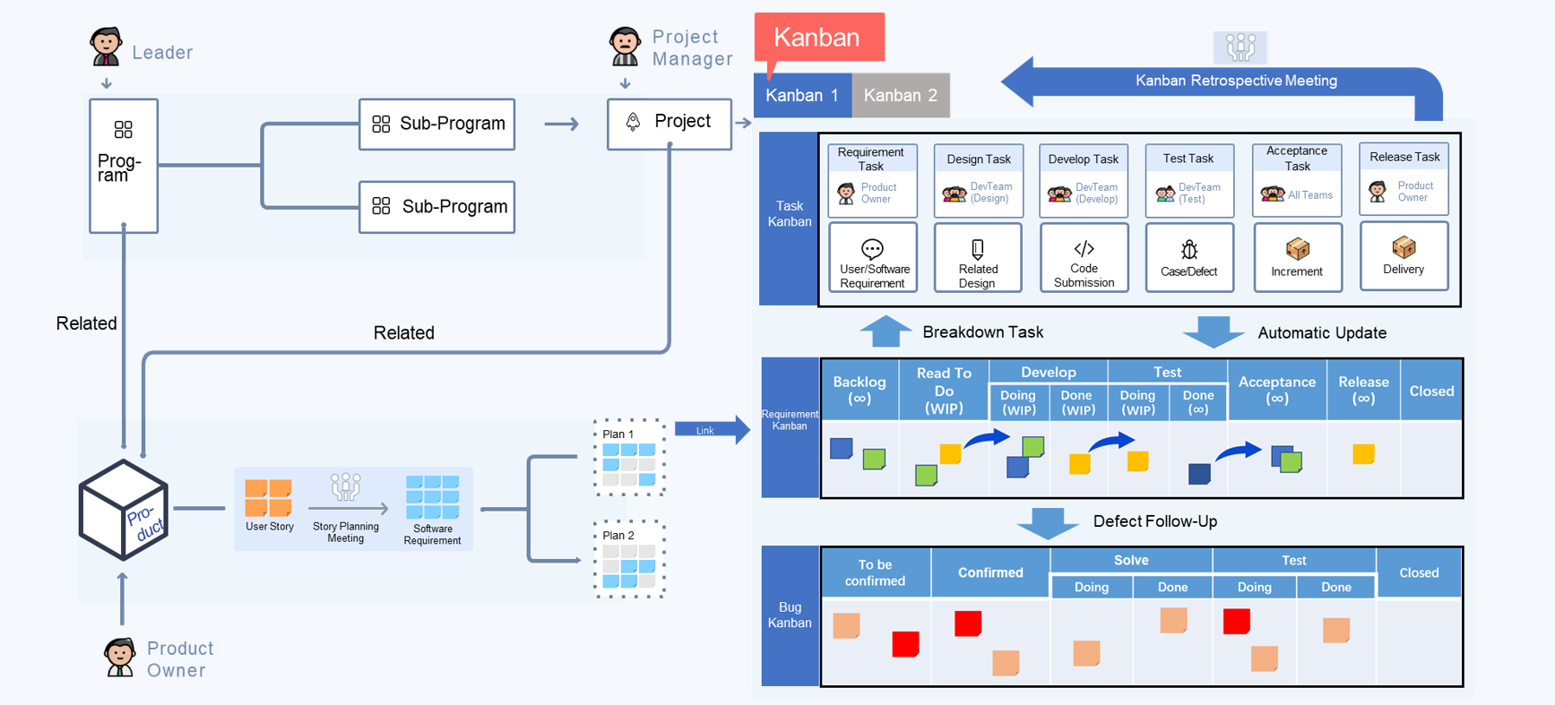 Kanban is a flexible framework in terms of team size and roles. It is particularly useful for identifying bottlenecks, and for fast-moving projects with simpler workflows. Kanban in ZenTao supports all the practices above. The picture below describes an overview of the Kanban model in ZenTao.