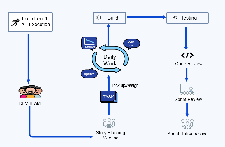 - Daily stand-up meeting: describe what you did yesterday, and what you're doing today. Identify obstacles and align iterative goals.