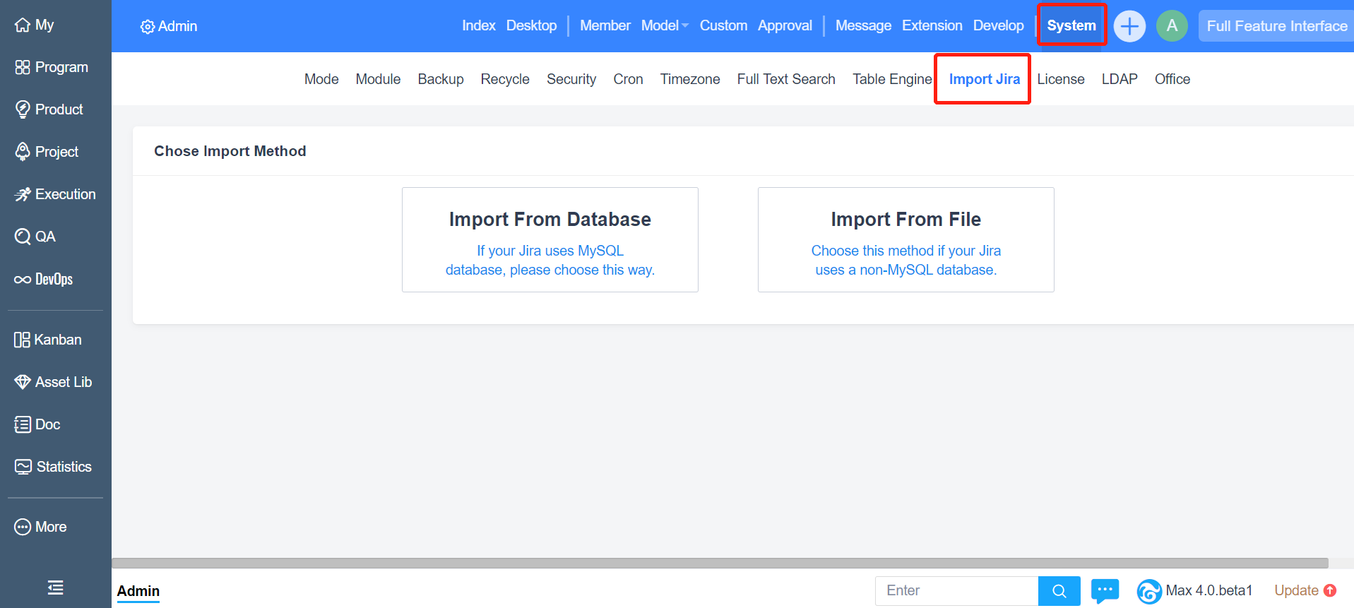 - The super administrator goes to More - Admin - System - Import Jira, and then selects the import method: Import from database or Import from file.