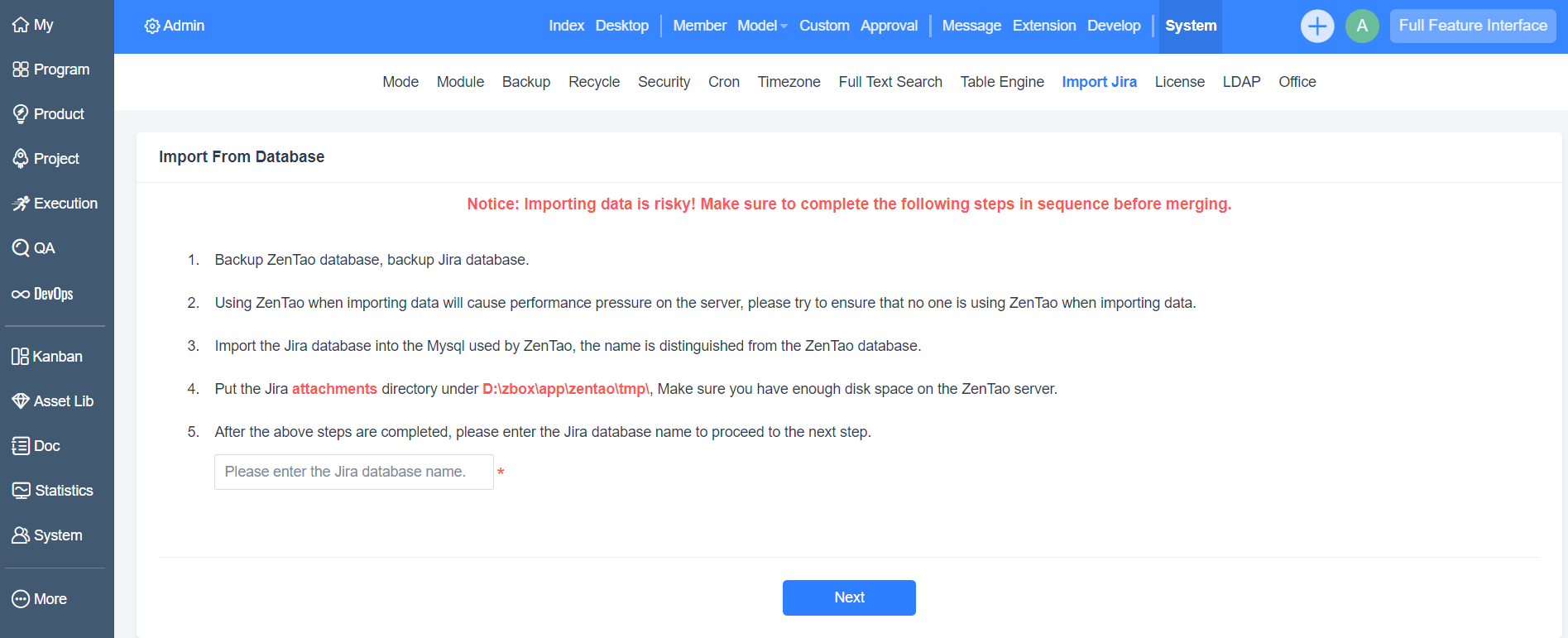 - Back up the database of ZenTao. Post a reminder of preparing for Jira data import, don't let others access ZenTao during the import process.