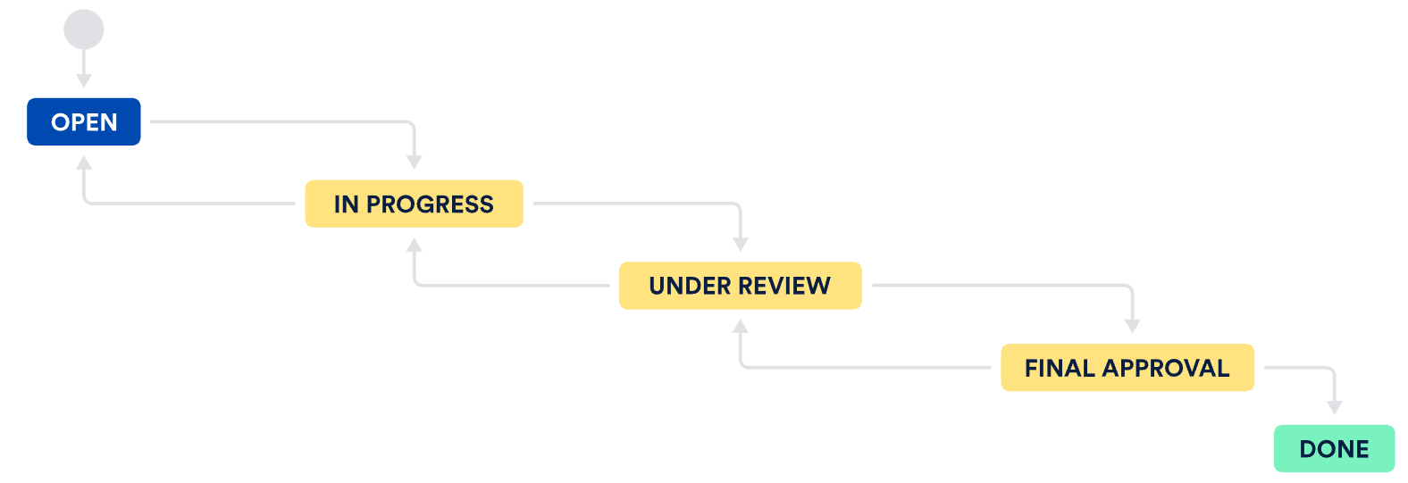 Workflows represent the sequential path an issue takes from creation to completion. A basic workflow might look something like this: