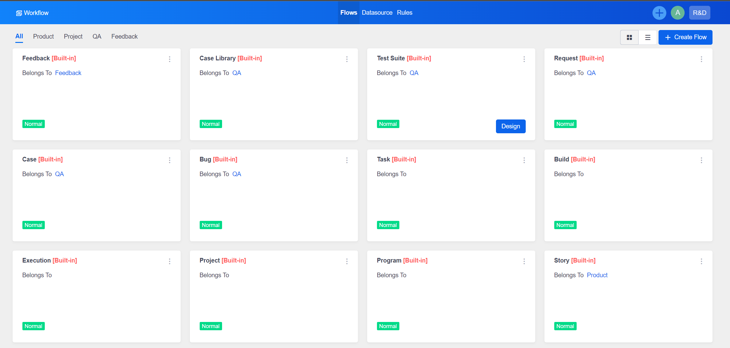 ZenTao can be highly customized with the workflow module. As for now, Workflow has 15 built-in processes based on the usage process of ZenTao, the functional modules, and the customization needs, including product view, product plan, release, requirement/story, program, project, execution, build, task, bug, case, test request, suite, case library, and feedback.