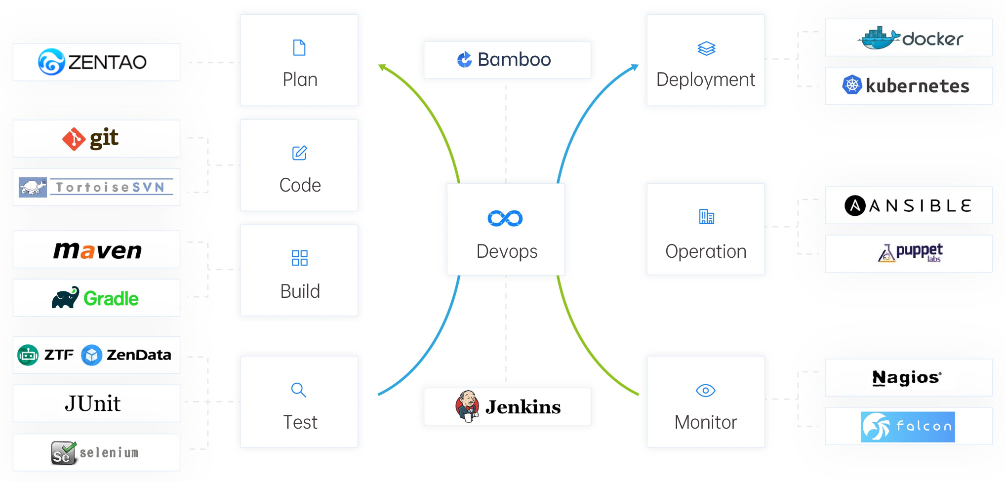 The support for DevOps of ZenTao, including Git, GitLab, Subversion system integration, Jenkins build task triggering and ZTF automation test scheduling.
