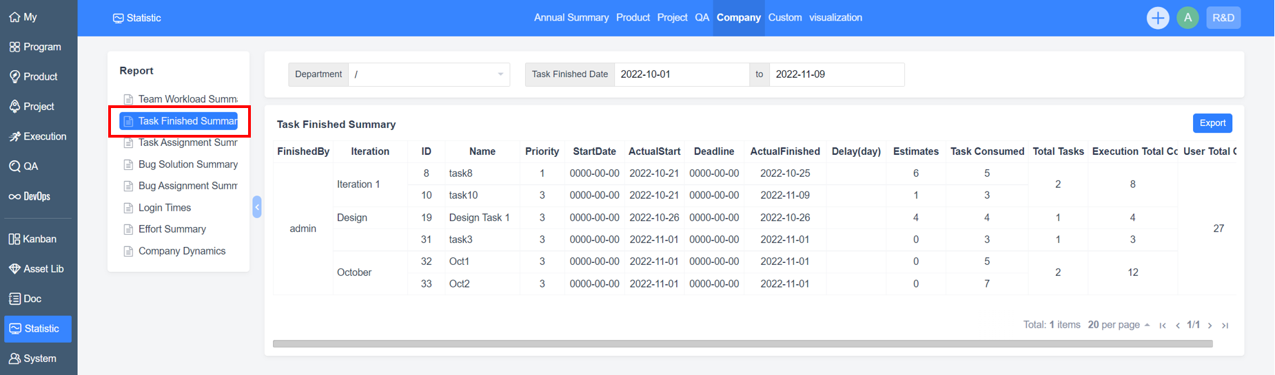 ZenTao Biz can export reports to the local computer. What's more, it supports the export of custom reports and project execution pie charts.