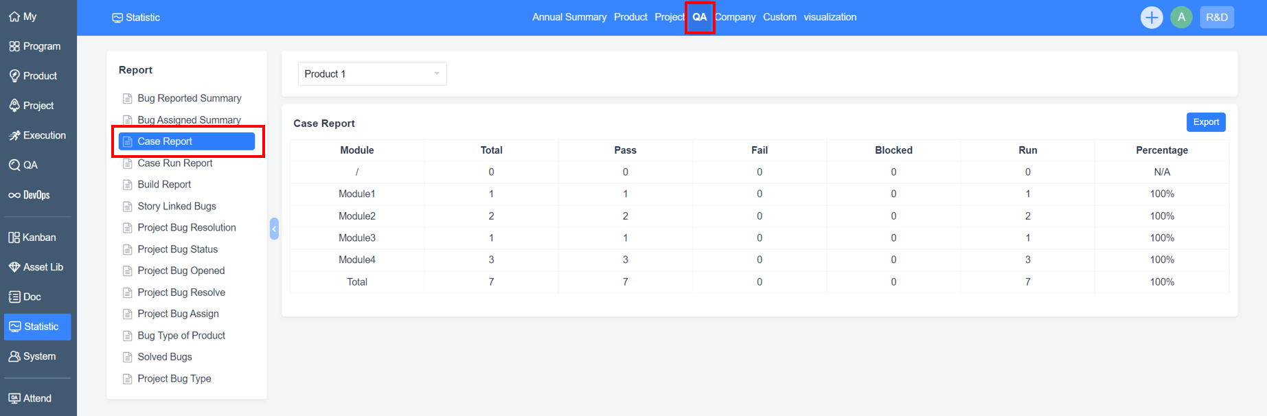 The Case Report in "Statistics" - "QA" allows you to count the number of cases, the result of case execution (Run), and the pass rate of cases (Percentage).