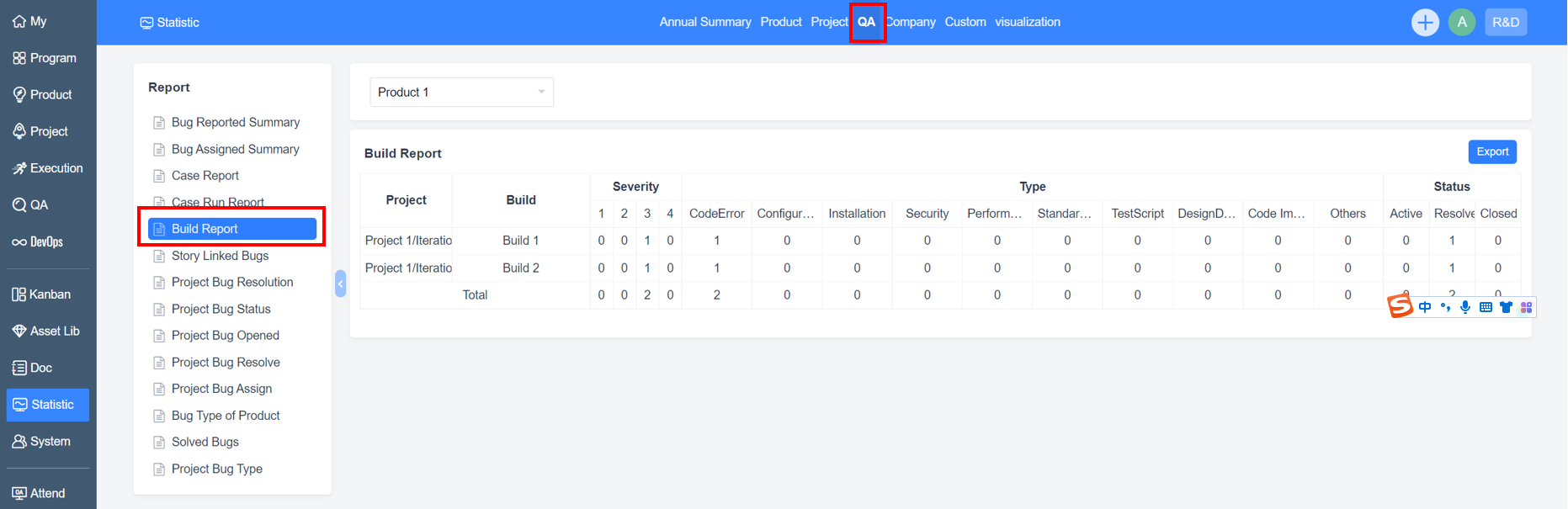 The Build Report in "Statistics" - "QA" allows you to count the data of each build.
