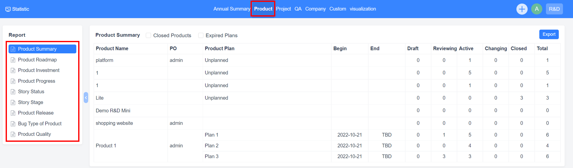 Some commonly used reports have been built in Zen Tao. ZenTao can summarize and analyze the data in the system to generate reports. At the same time, ZenTao supports exporting the reports to the local computer and also supports the custom reports. In the "Statistics" section, ZenTao summarizes data from products, projects, QA, and the company, then presents the data in multiple dimensions through reports. The product-related reports, project-related reports, and QA-related reports can be viewed in ZenTao Opensource Series, there is no further elaboration. As for the custom report, we will discuss it in the next chapter.