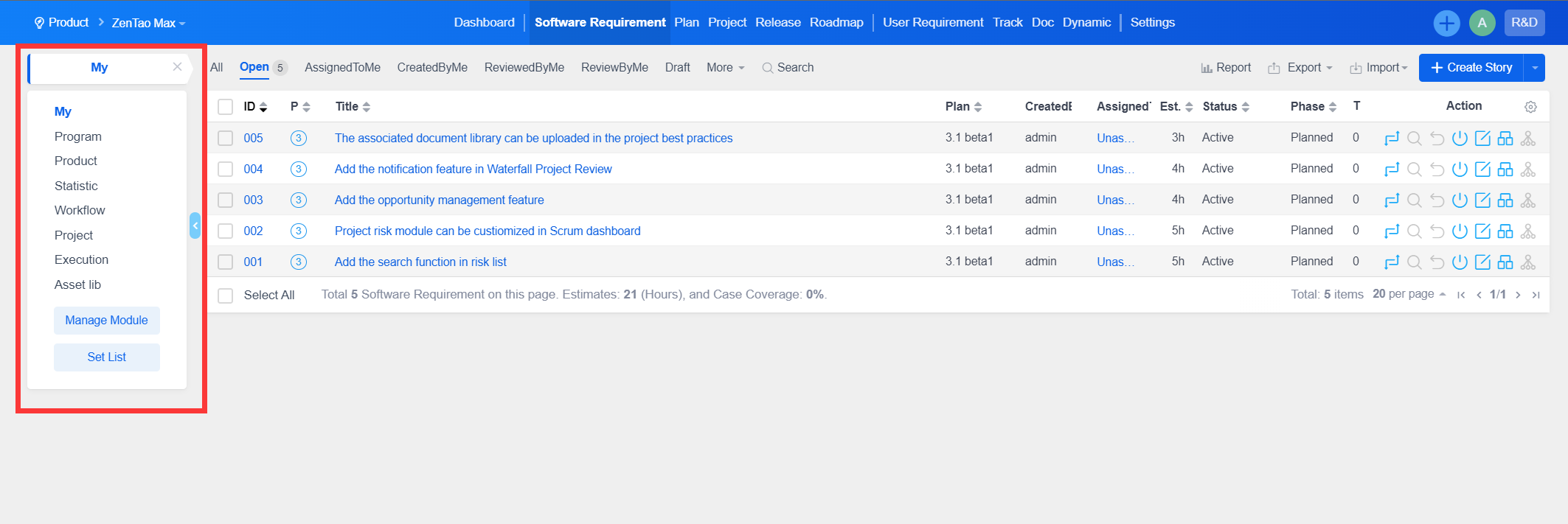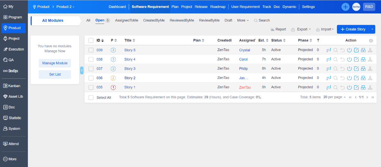 However, we don't have the automation templates to create user requirements/software requirements in ZenTao. Zen Tao's requirements management uses a fixed process and is the best practice of agile concepts.Every user requirement needs to be analyzed and viewed by PO, and not all the user requirements will pass the review to flow to the software requirement pool. We have to admit that some user requirements are beyond the Dev team's ability and require further negotiation, but that's precisely the behavior responsible for end users.
