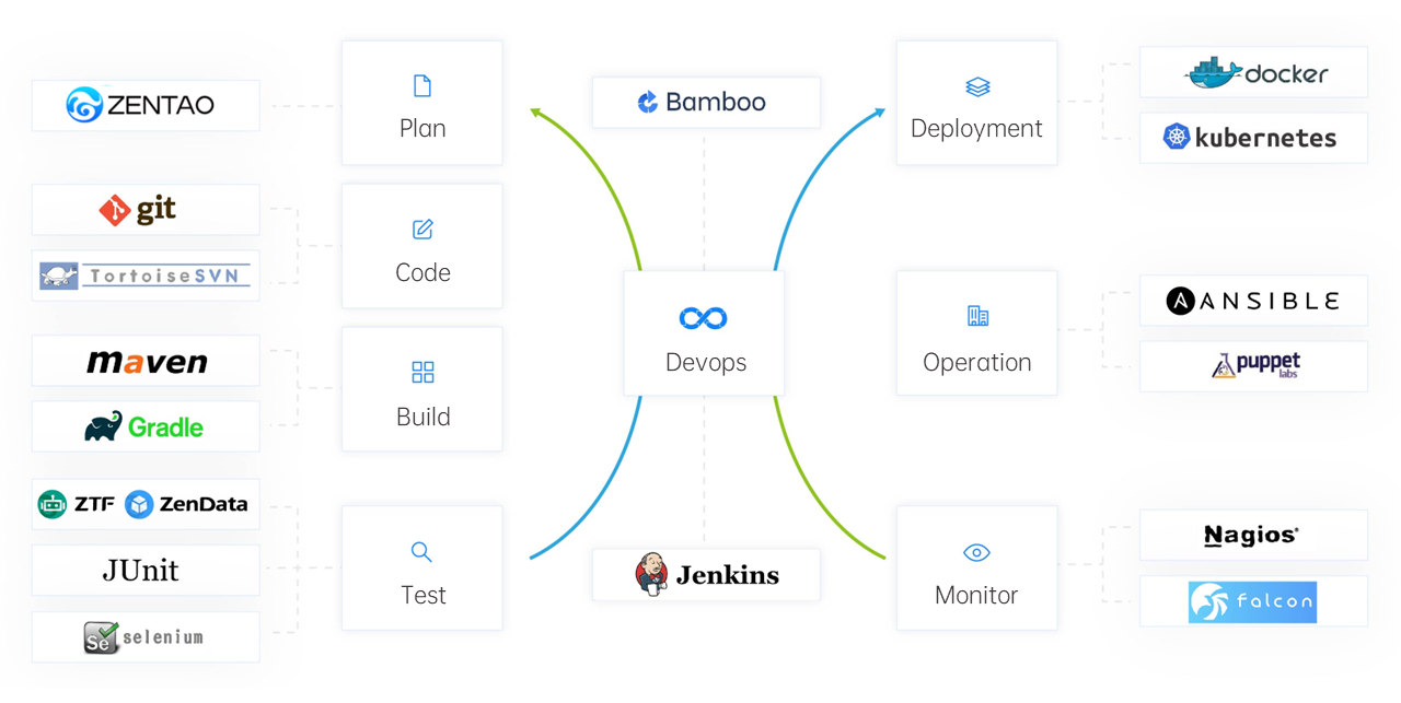 The support for DevOps of ZenTao, including Git, GitLab, Subversion system integration, Jenkins build task triggering and ZTF automation test scheduling.