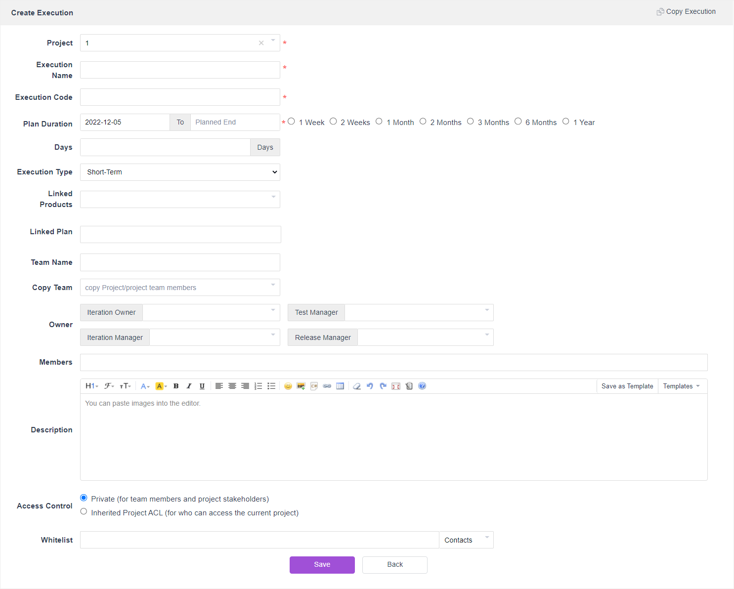 - Select Create Execution in execution list or select Create Iteration in project > one specific project > iteration and edit the relevant iteration information.