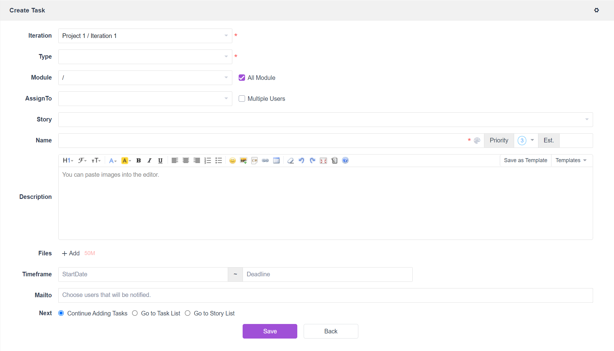 Tips: If you tick the No with multi iteration checkbox when creating a project, you will be able to create tasks via Project < Project List < One specific project < Task < Create Task.