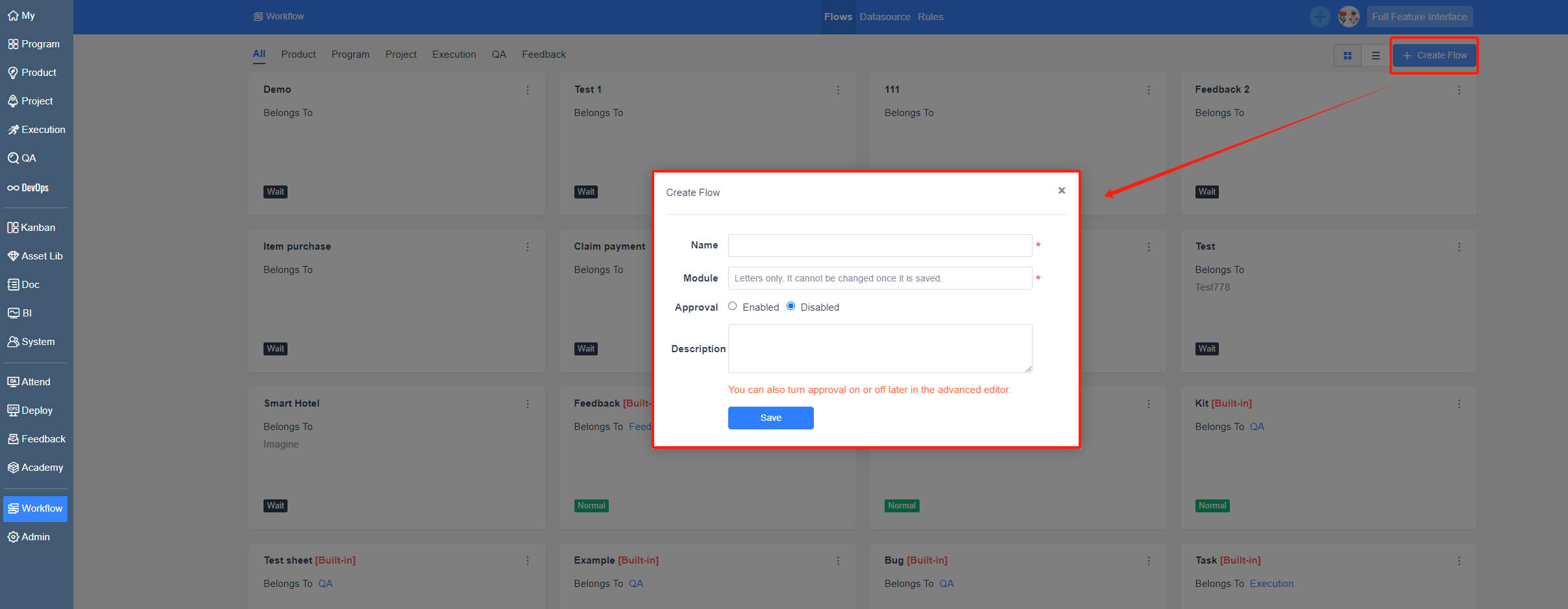 To create a new workflow, click the "Create Flow" button in the upper right corner of the Workflow - Flows page. Once published, the workflow will appear in the corresponding navigation menu.