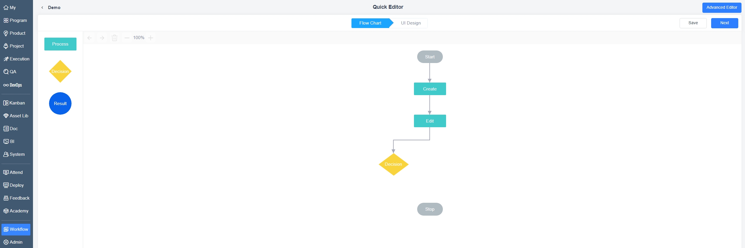 The process diagram in quick editor mode enables rapid visualization of complex workflows, providing a comprehensive understanding of the entire process's logic and content. This serves as a foundation for subsequent interface design, ensuring clarity and control throughout the workflow.