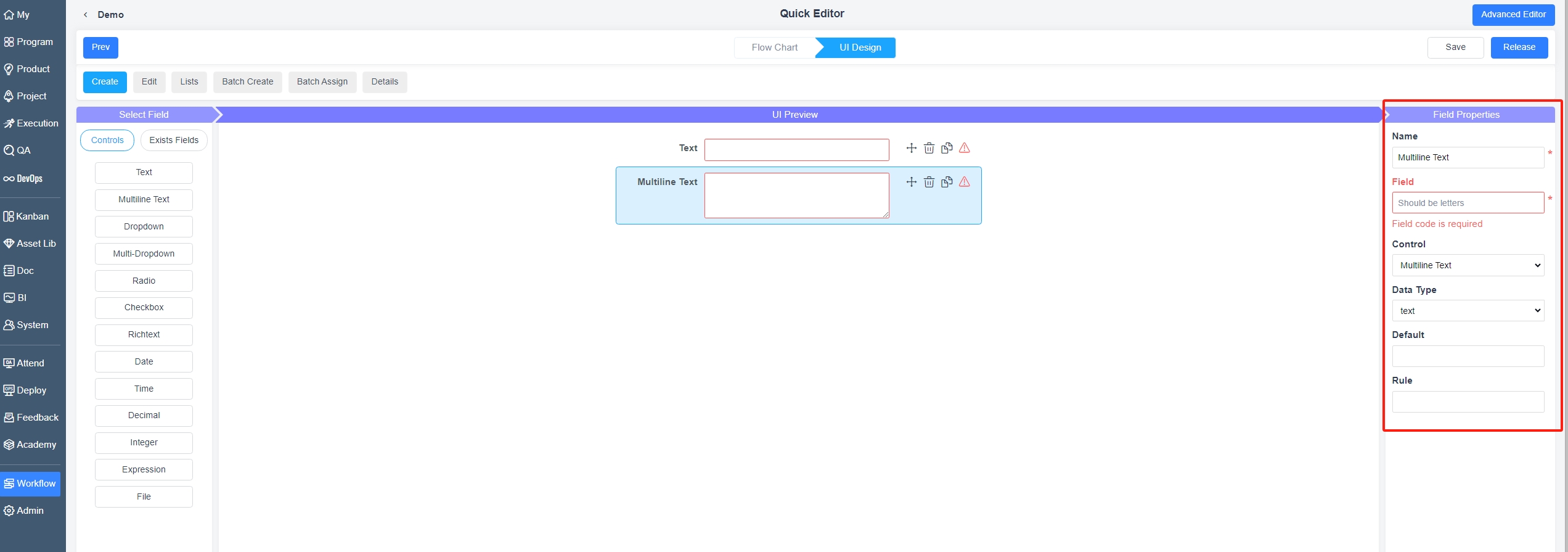 In quick editor mode, you can swiftly select necessary field controls through drag-and-drop, moving, and editing to design relevant pages. Choose items from the left and drag them to the interface preview. Once selected, you can edit details using the properties panel on the right.