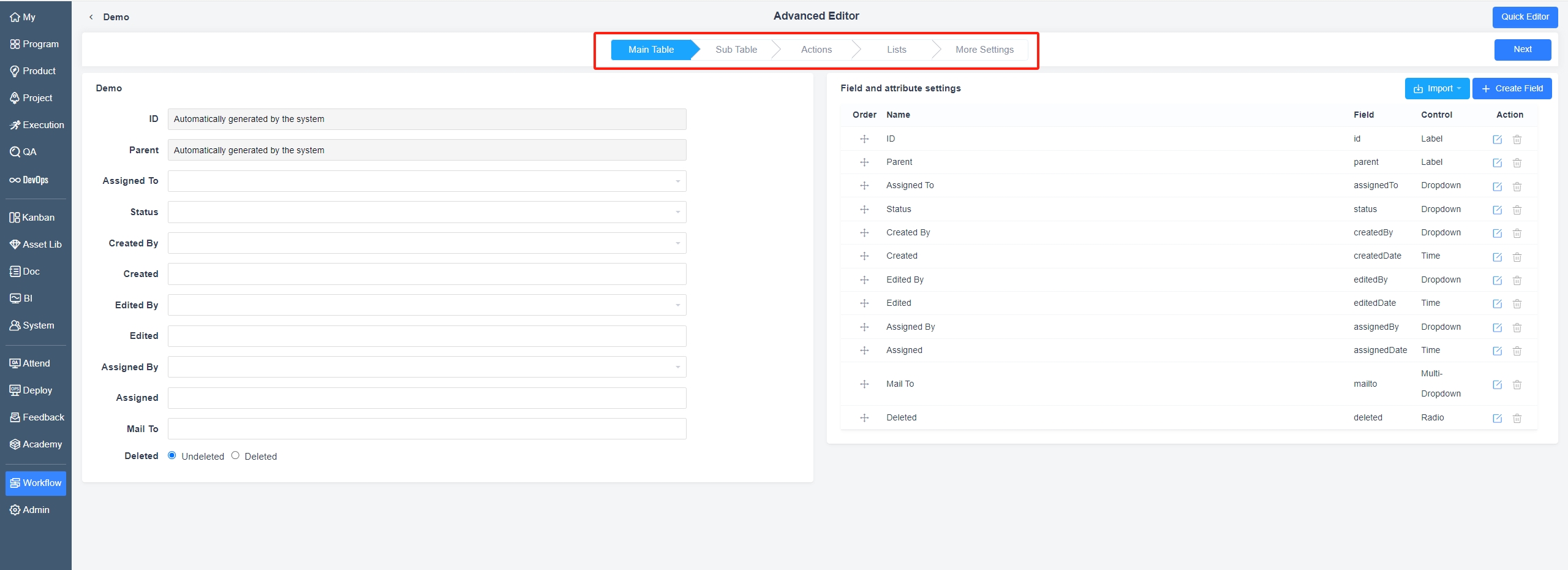 - Main Table Design: Configure fields and attributes in the main table.