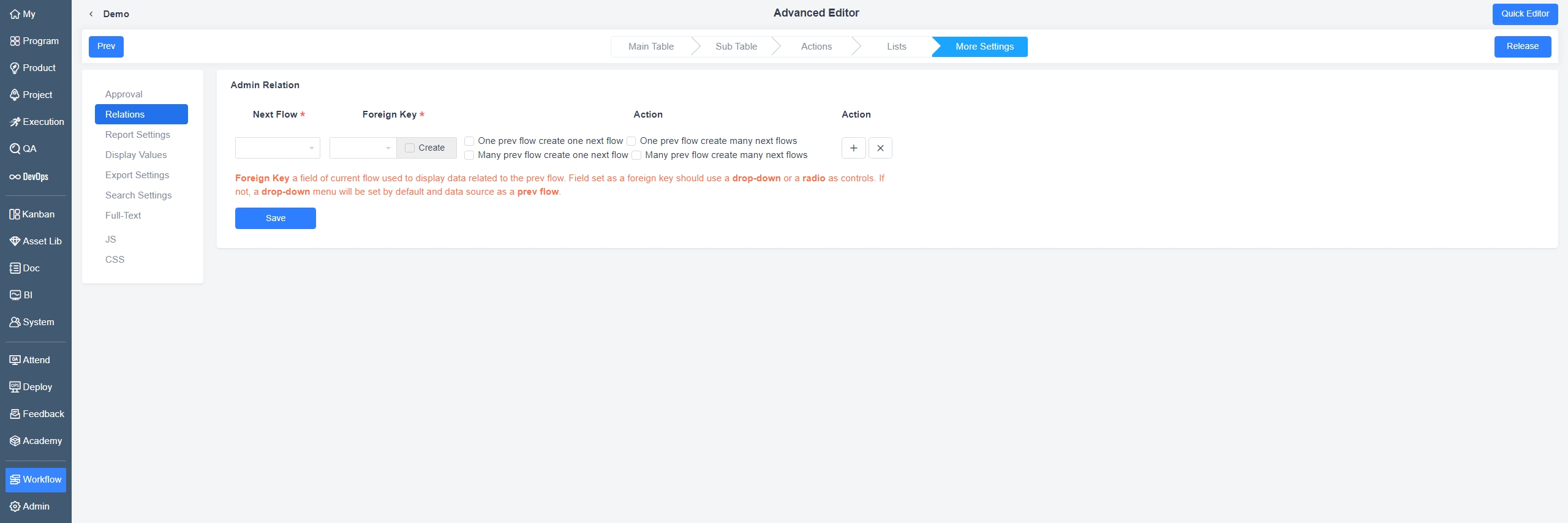 The advanced editor mode allows for richer and more detailed workflow design, including main table design, sub-table design, action design, tag design, and additional settings such as cross-process configurations, export settings, search settings, and custom JS and CSS.
