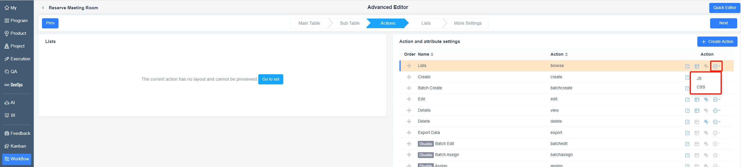 ZenTao Workflow provides the ability to set JavaScript (JS) and Cascading Style Sheets (CSS) functionalities. Users can utilize this feature to add JS and CSS code to the action interface of configured workflows. This can be applied to all pages of the process or to a specific action page.