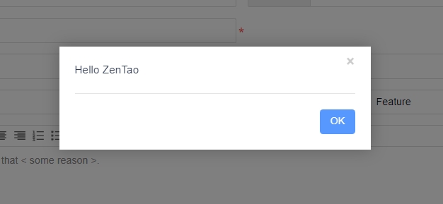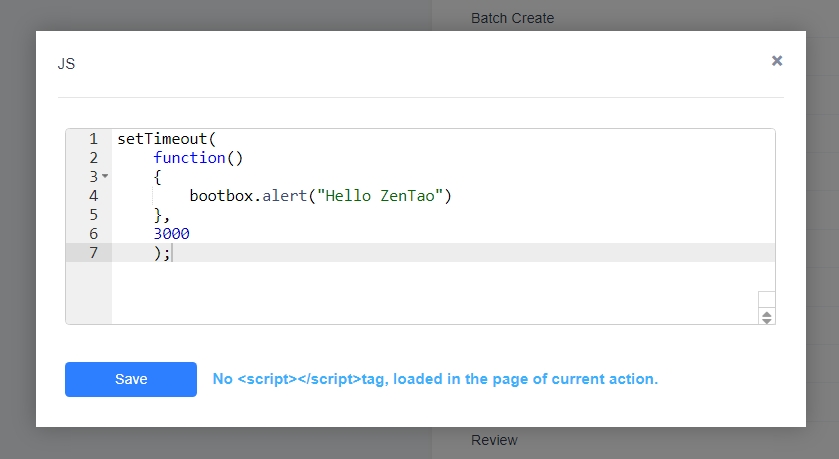 To illustrate the JS settings, let’s take the list page as an example: After three seconds, a pop-up will display the message “Hello ZenTao.” Click the JS button in the action page, and enter the following code in the pop-up code editor, as shown in the image: