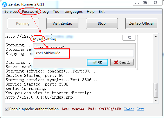 - Restart the service via ZenTao Runner after you change the configuration and save it. Stop the service and restart it.