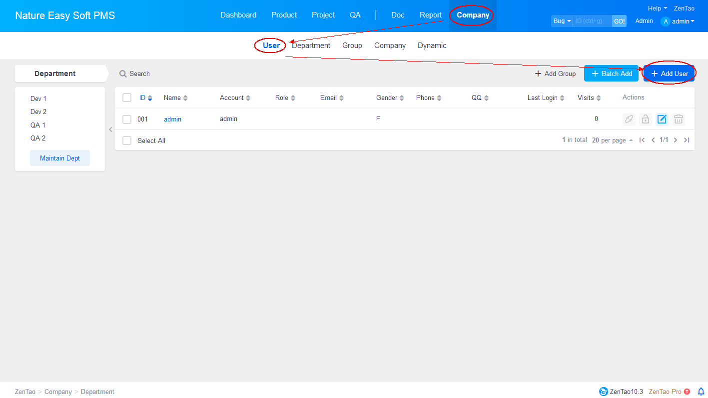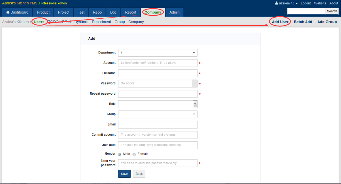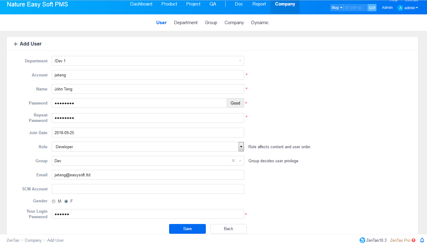 1. The field of Role has been added since ZenTao 4.0. You can choose corresponding Roles when adding users. Roles will affect the order of