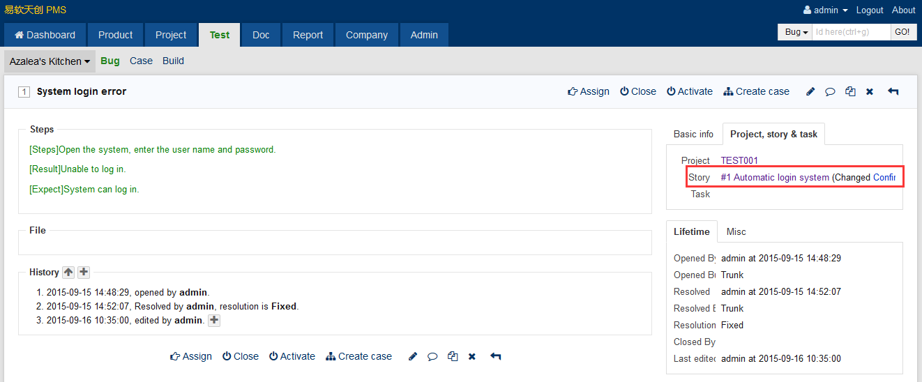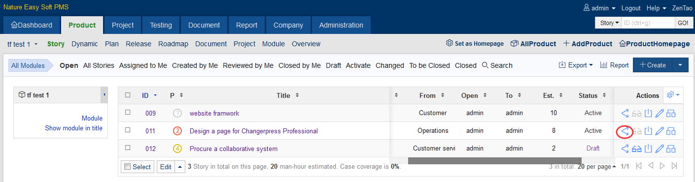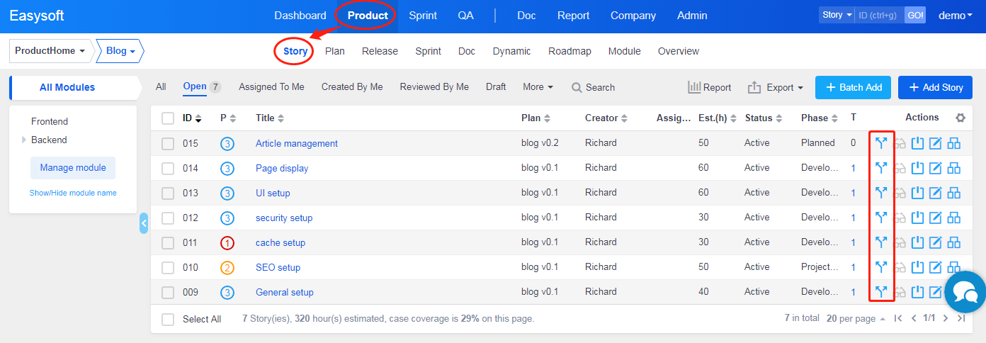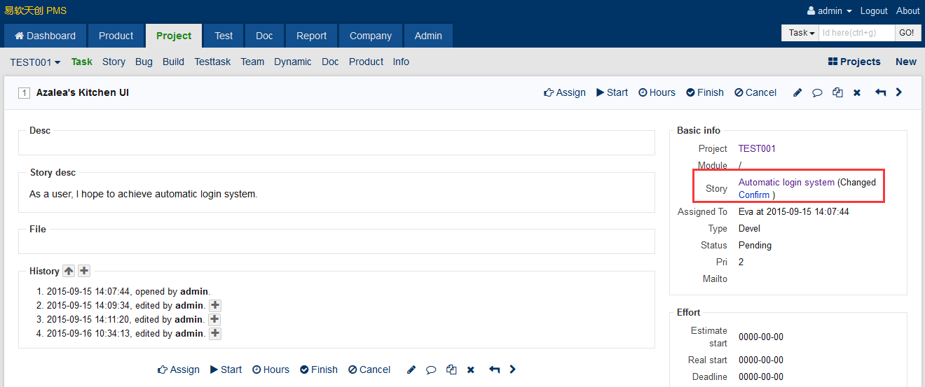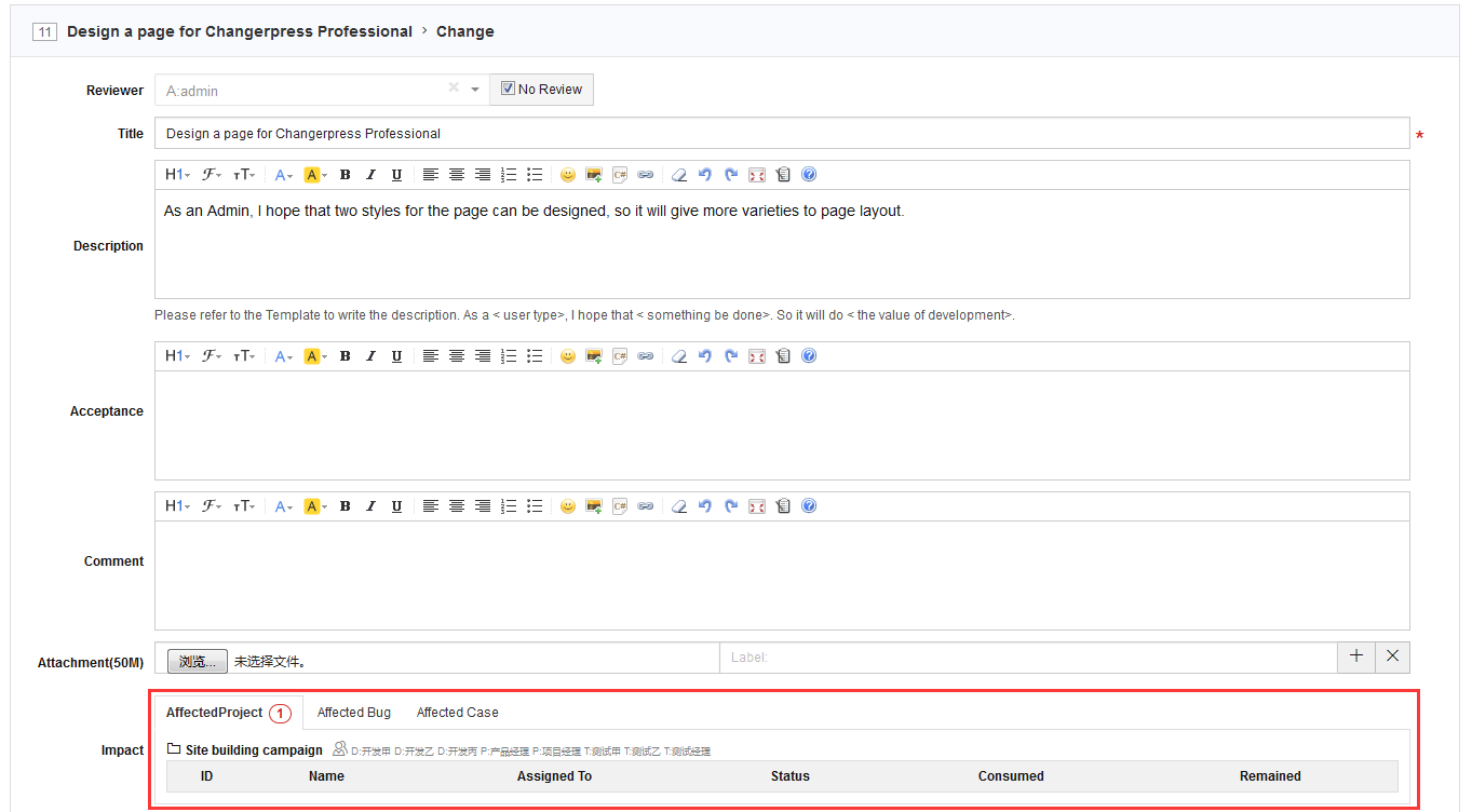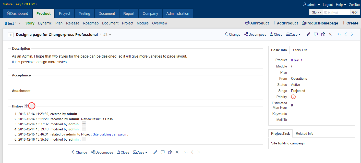 Change management is an essential process in story management. Story change is not complicated, but it can be complicated when the scope that a change can impact is not clear. In traditional project management, a project manager cannot define the impact due to the lack of software. In ZenTao, stories, tasks, bugs, and cases are integrated, so the impact scope can be defined.