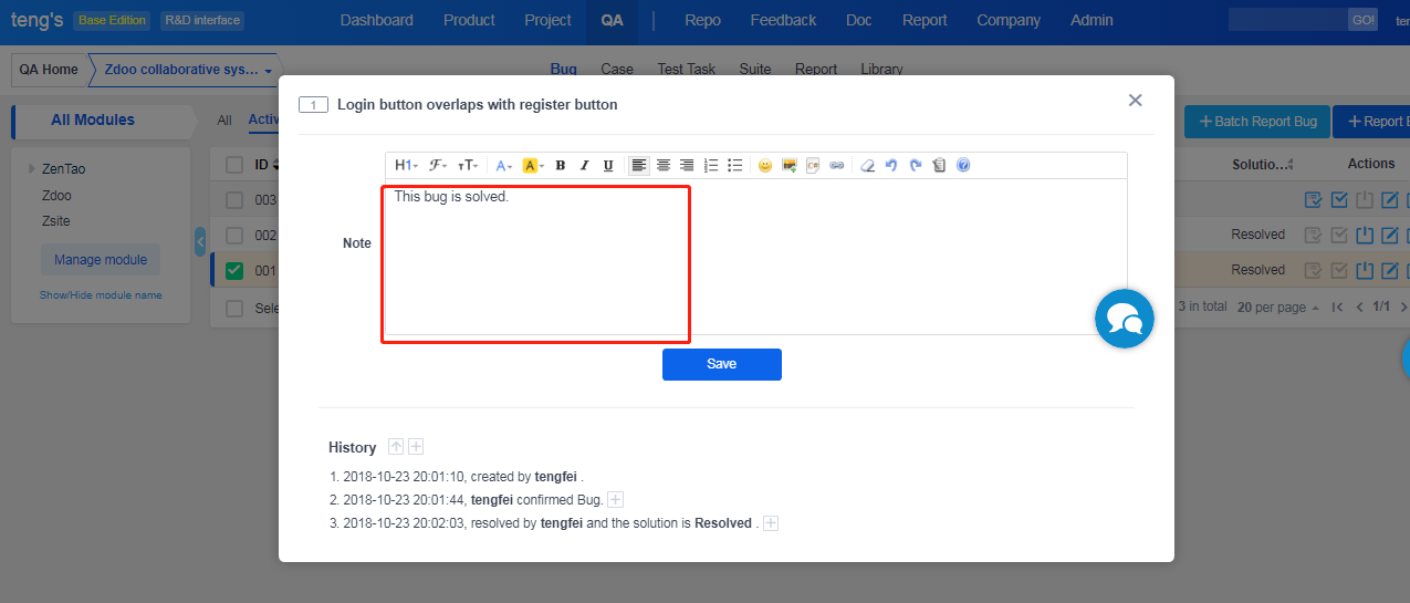 Write the note for the bug to be closed and click Save.