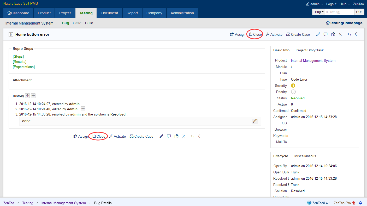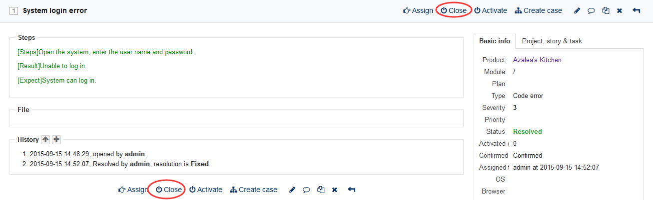 Click the Close button to close the bug.