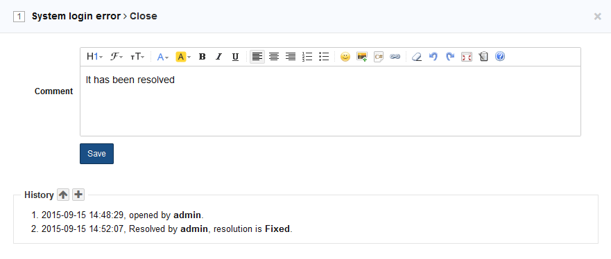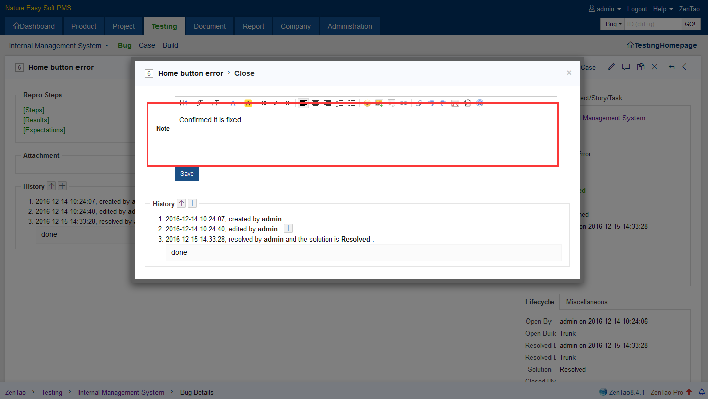 Write the note for the bug to be closed and click Save.