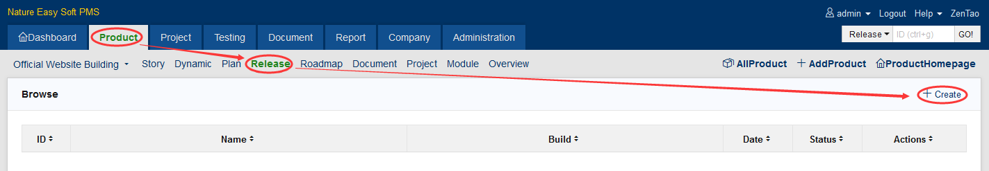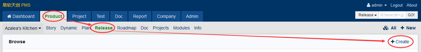 2.1 Go to Product->Release and click Create and the page of creating a release will pop out.