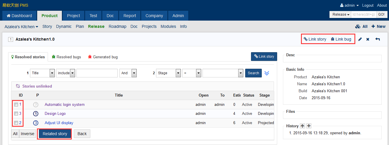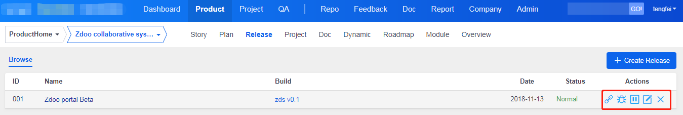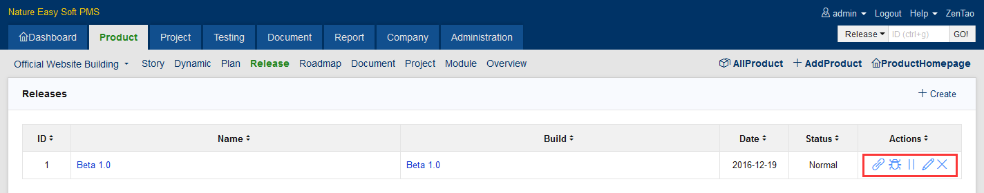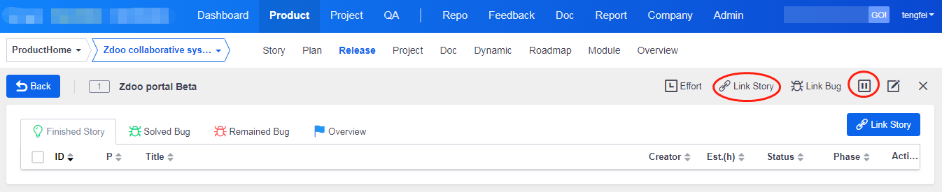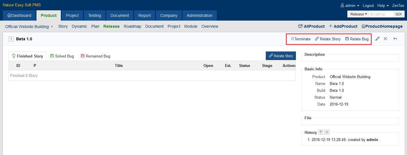 2.2 Once created, you can relate it to Story/Bugs. You can also terminate the release which means it will not show in ZenTao anymore.