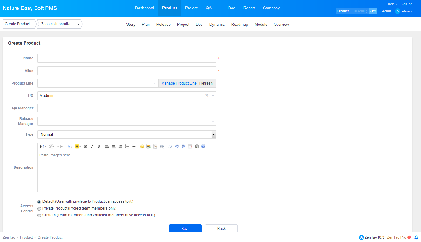 - The fields such as name and alias of the product are required. The alias is the nick name of the product within the team, e.g. the alias for ZenTao Project Mangement Software is zentao. It should be a combination of letters and numbers.