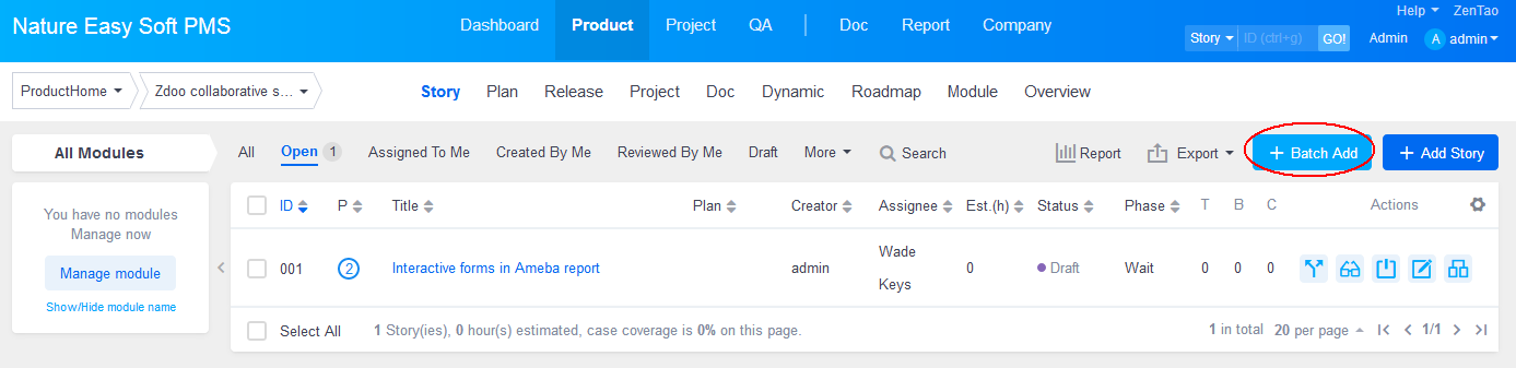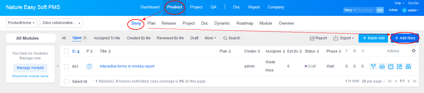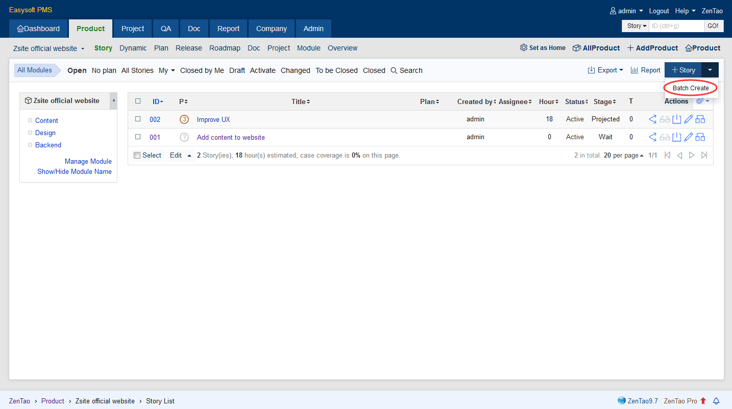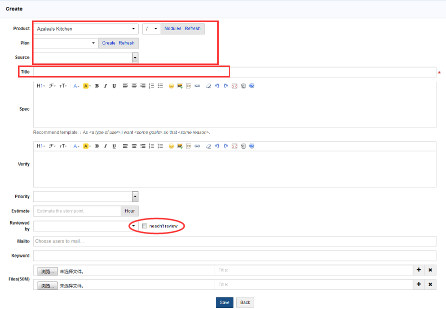 Product managers may be used to write stories or specifications. Stories about a product usually are defined in a Word file. However, we suggest that your write stories in ZenTao be written by functions. Generally speaking, stories are excerpted from the original Word file and recorded in ZenTao as separate stories. According to Scrum, it is a user story. A user story is to describe user types, user objectives or values of the objectives. With all the information, it’s very convenient to communicate and cooperate with the team.