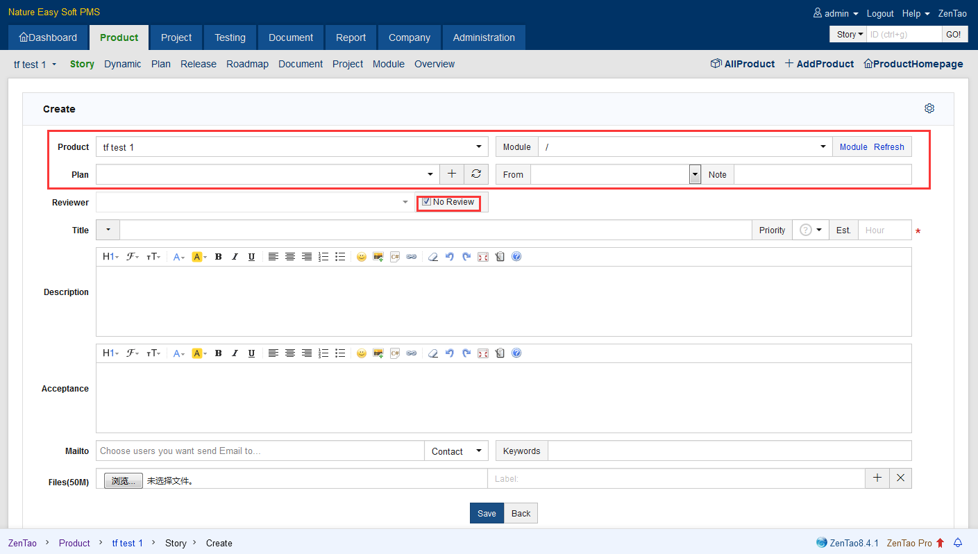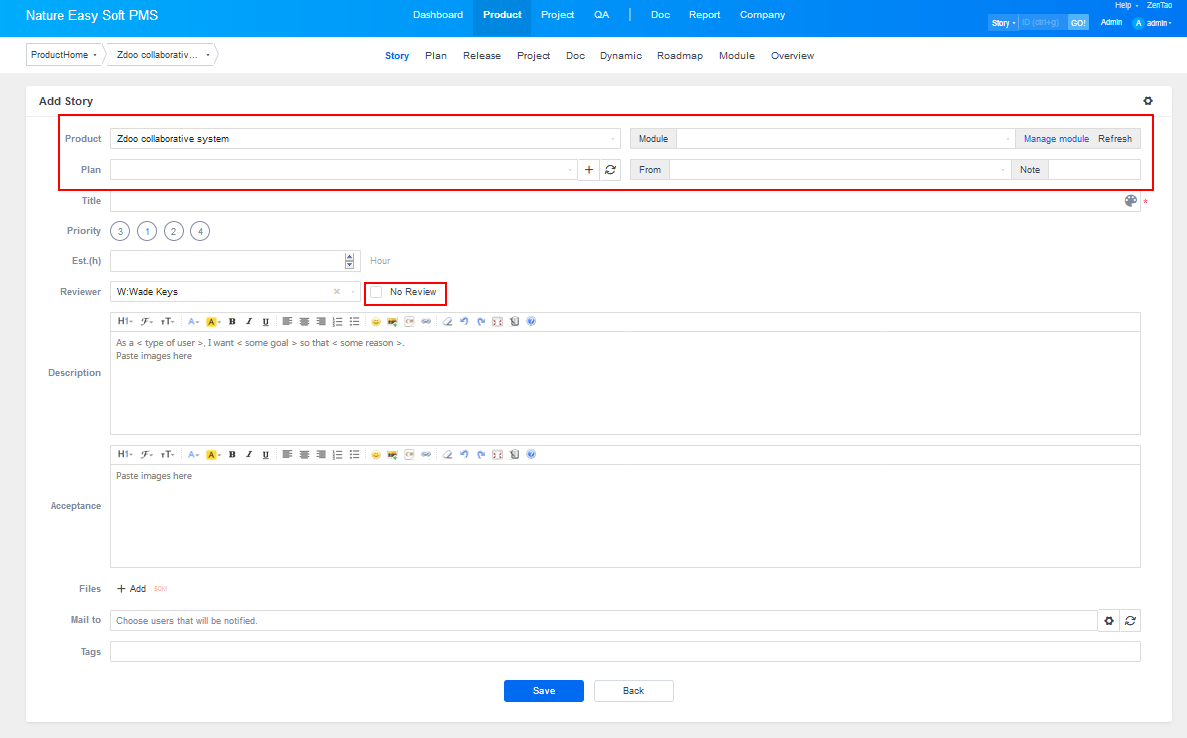 - Check "No Review" in Reviewed By, so the Story that is about to be added is activated. Only activated story can be linked to the projects and then to be developed.