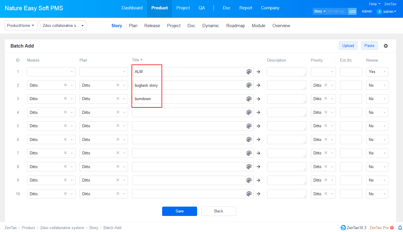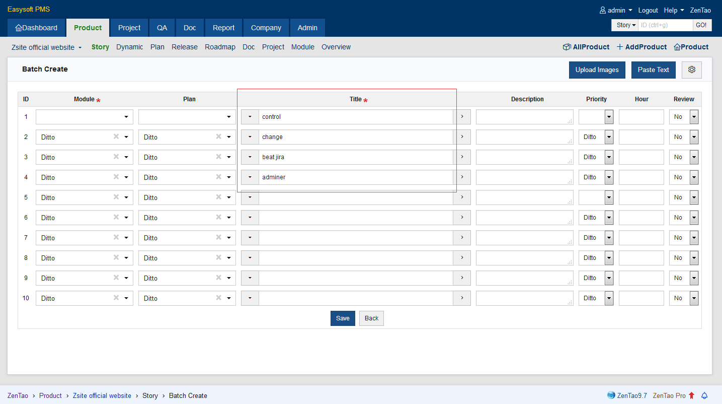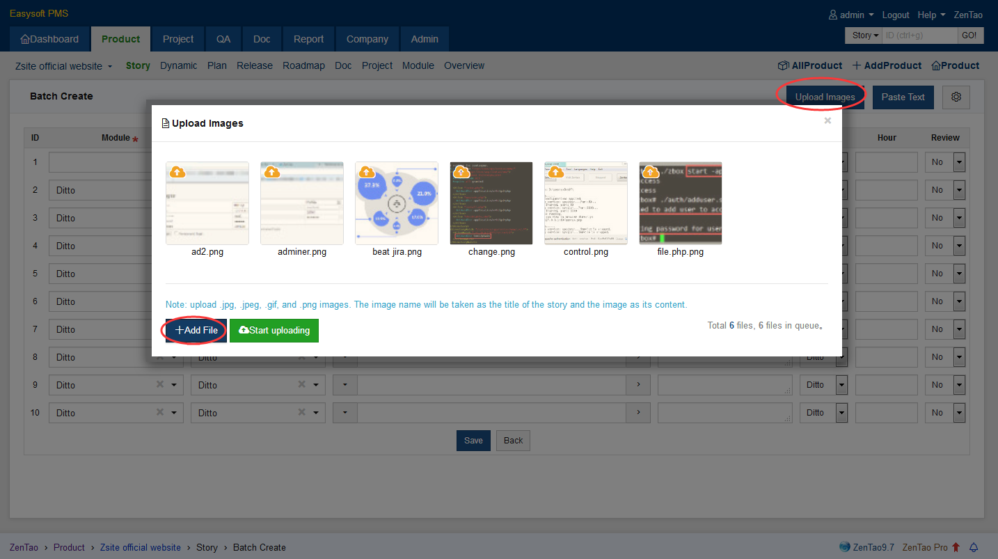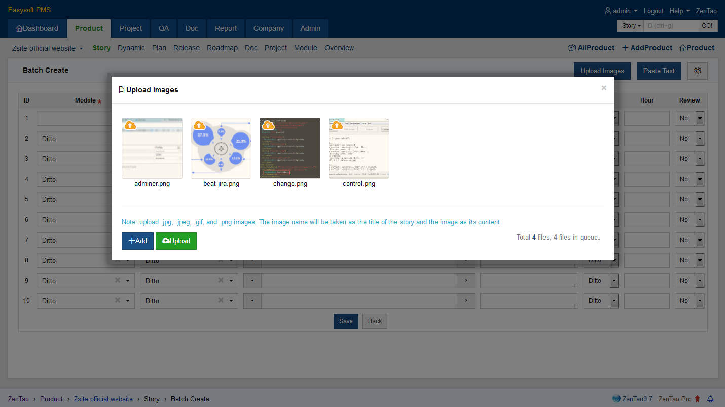 After the images are uploaded, ZenTao will take the name of the image as the title of the story and the image as its content.